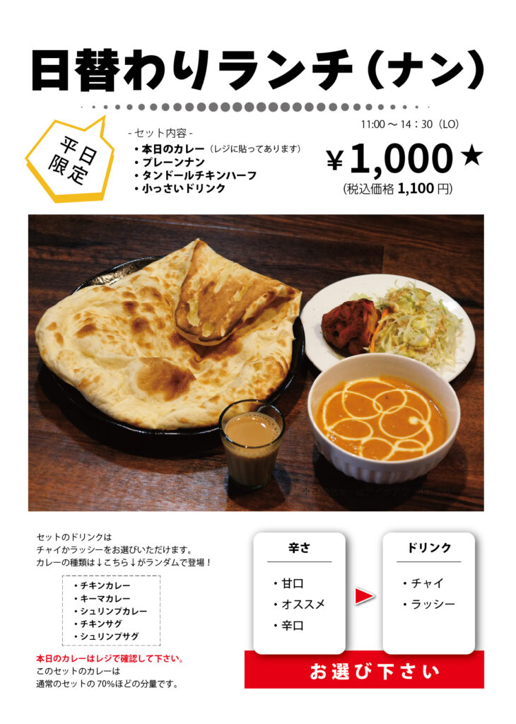 本日のカレーはチキンカレー・キーマカレー・シュリンプカレー・チキンサグ・シュリンプサグの中からランダムで登場します。